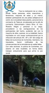 Personal policial de dicho distrito encabezada por la jefa de la Comisaría Sub. comisario Liliana Silva Of. auxiliar Alegre Roberto y personal a su cargo procedieron a las averiguaciones de los participantes del hecho, pudiendo dar con la mayoría de ellos quienes en su totalidad, fueron imputados en una causa contravencional por la infracción del artículo 48° 49° y 50° del código de faltas de la provincia de Corrientes, asimismo, los imputados fueron notificados de las consecuencias de la reincidencia en estas faltas.