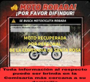 Continúa el buen accionar de la policia de Santa Rosa, en el dia de la fecha y en horas de la madrugada, se apersonó una ciudadana, oriunda de la localidad de Concepción, en el recinto de la guardia de la comisaría local, quien manifestó, que había dejado estacionado su motocicleta Skua 150. Color negro y blanco, sin patente colocada, en cercanías del corsodromo local, en un estacionamiento para motocicletas, solamente con el traba manubrio.